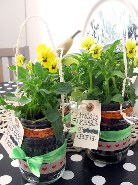 Kesälomalle lompsiessa lähti kouluun ja hoitoon kukkia. Orvokkeja istutettuna isohkoihin lasipurkkeihin. Purkit koristelin pitseillä, nauhoilla ja juuttinarulla.